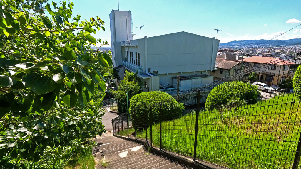 階段の上には、フェンスに囲まれた無機質なコンクリートの施設。