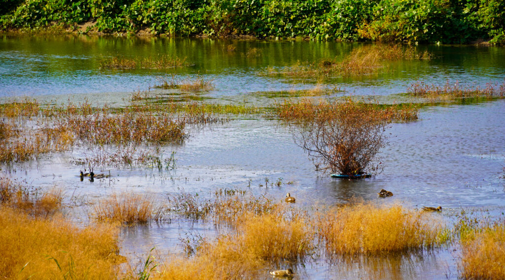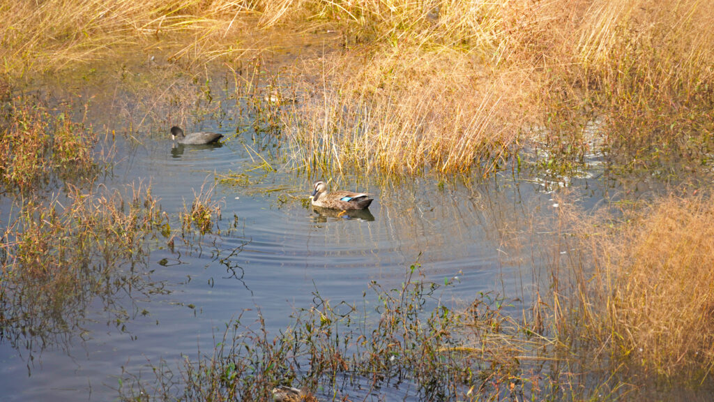 それでもわずかに水が残っており、静かな水面にはカモの姿も見られます。