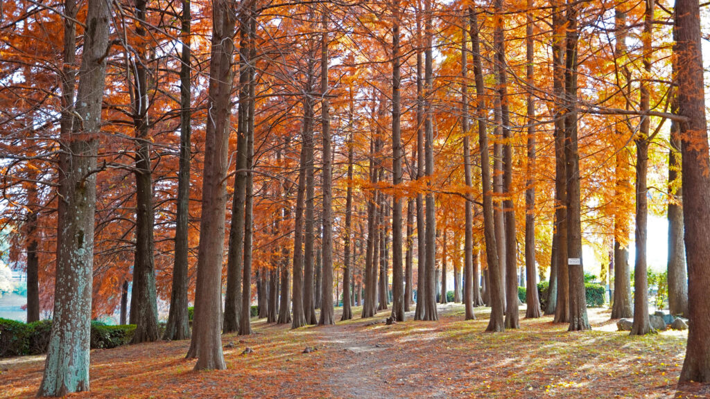 公園に入ってすぐ目に入ったのは、紅葉してオレンジ色に輝く「ラクウショウ」の林。
