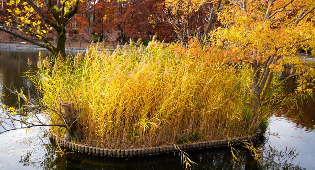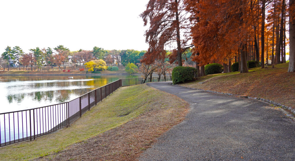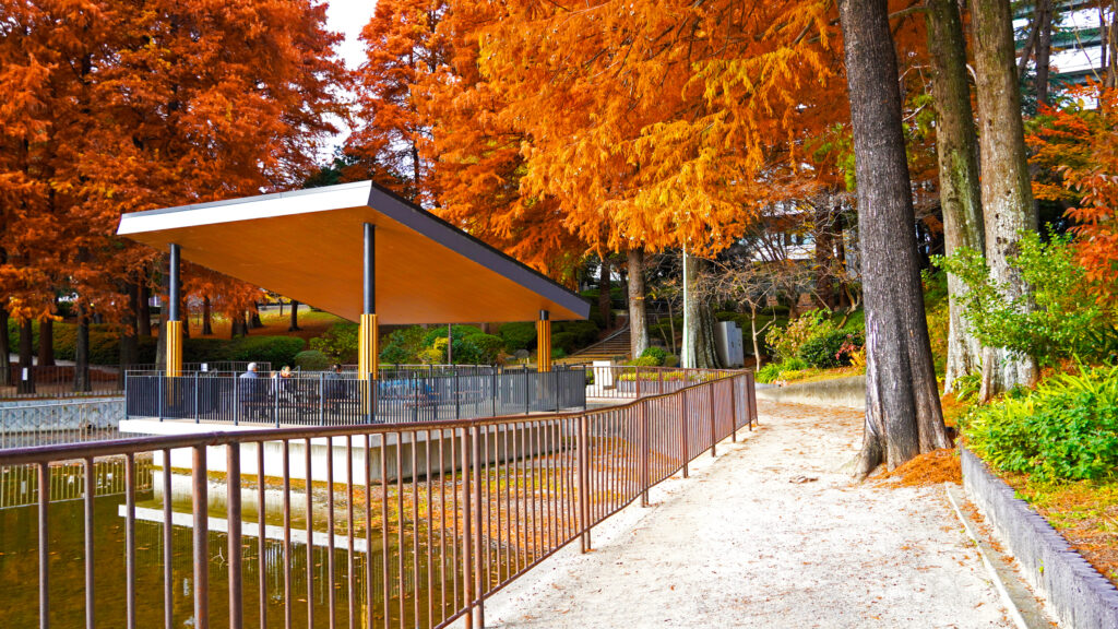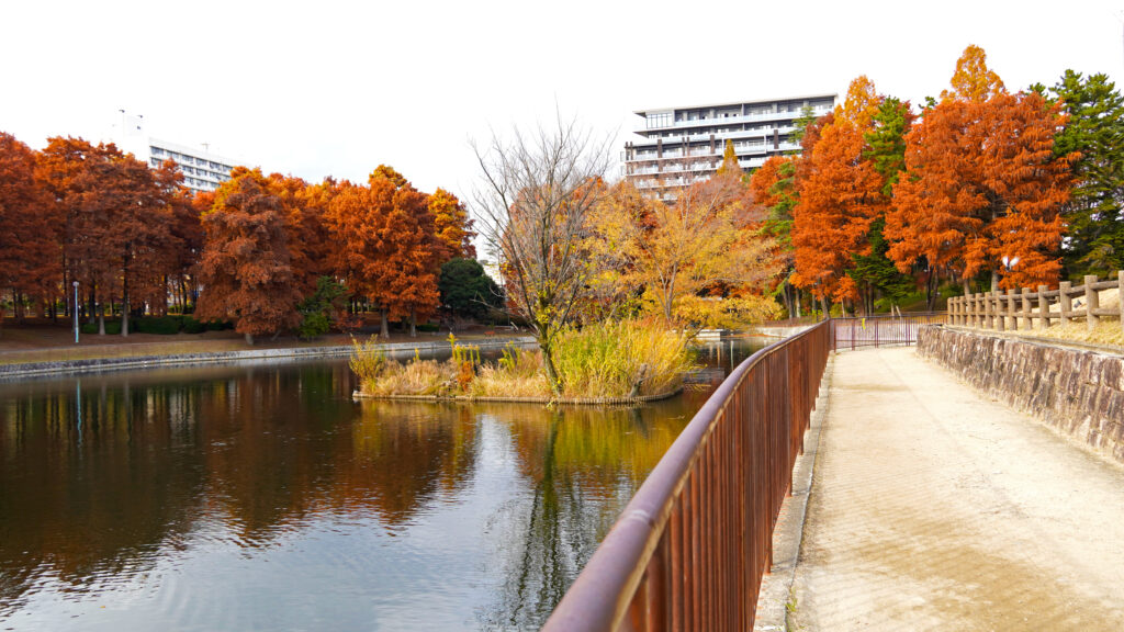 この公園は、桜や花桃が咲く4月が美しいとされていますが、晩秋に見せる紅葉も、決してそれに劣らない魅力があるように感じます。