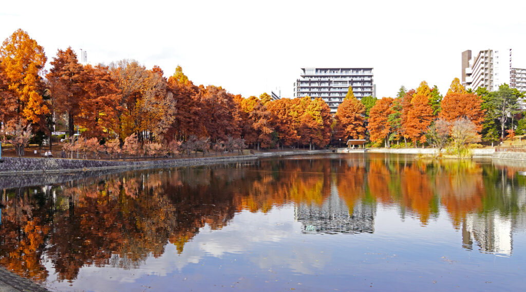 池を半周ほど歩いてみると、向こう岸に広がる、綺麗な紅葉を眺めることができました。