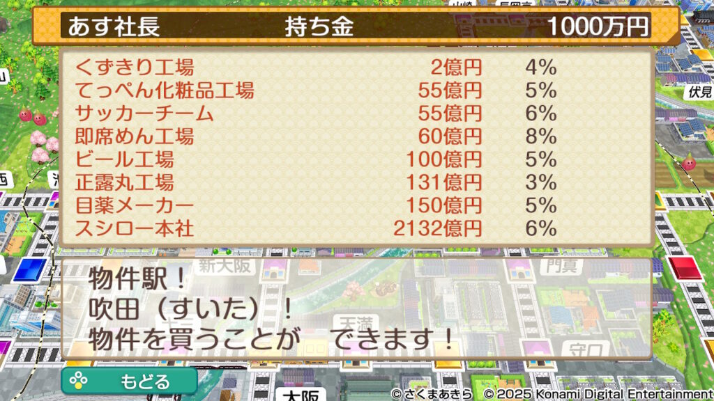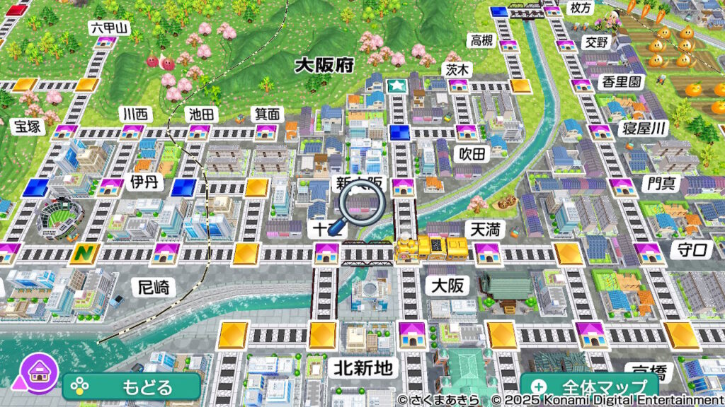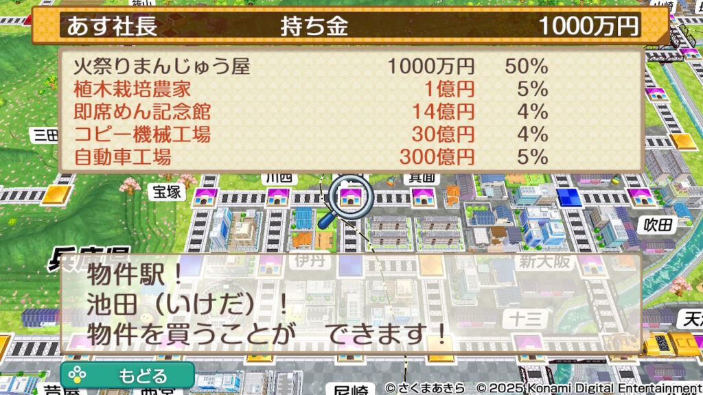 「桃太郎電鉄」では、各地の駅に止まり、その駅に用意された「物件」を購入することで資産を増やし、ゲームを有利に進めていきます。